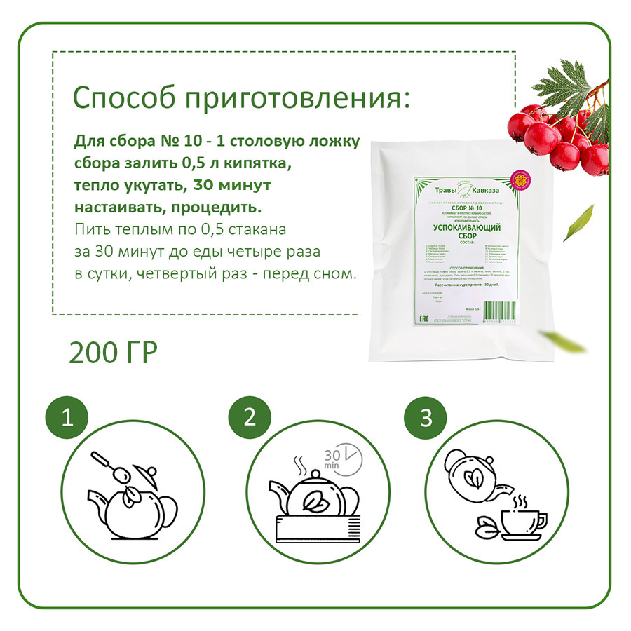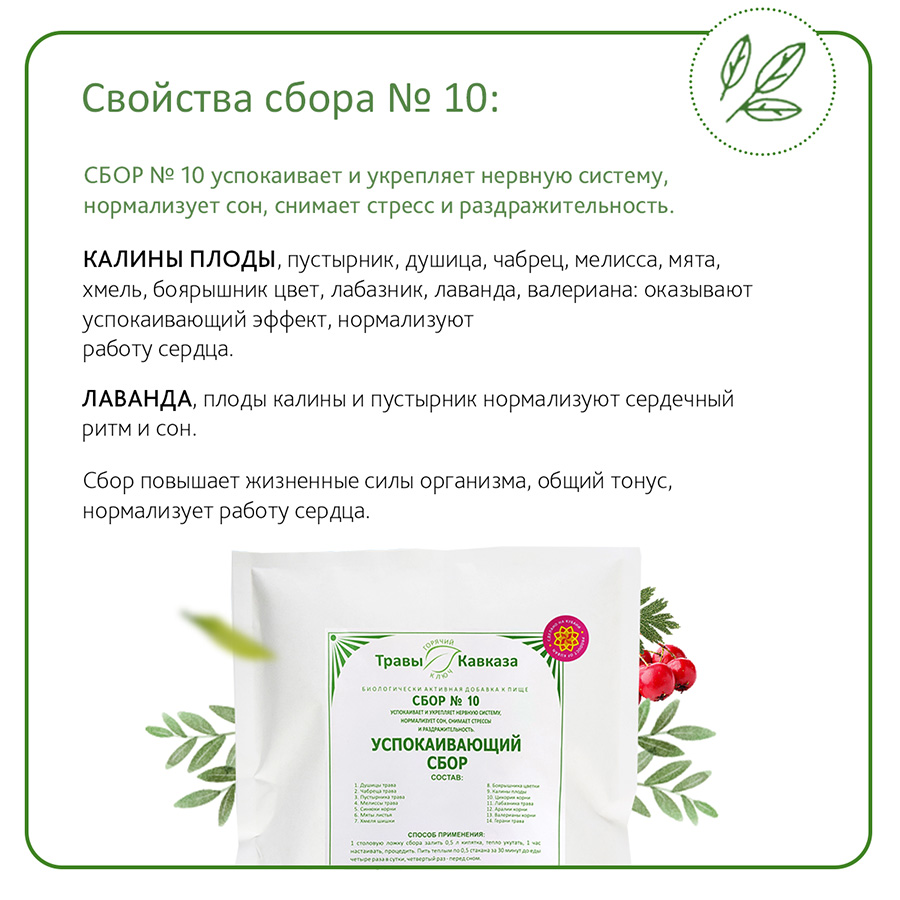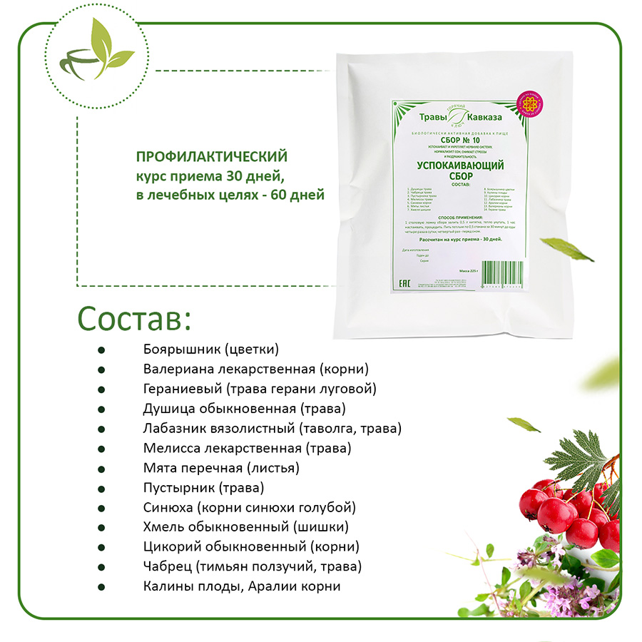 Сбор №10 разработан для мягкого восстановления нервной системы и улучшения общего состояния организма. Благодаря уникальному сочетанию лекарственных трав, он помогает справиться со стрессом, нормализует сон и поддерживает работу сердца.