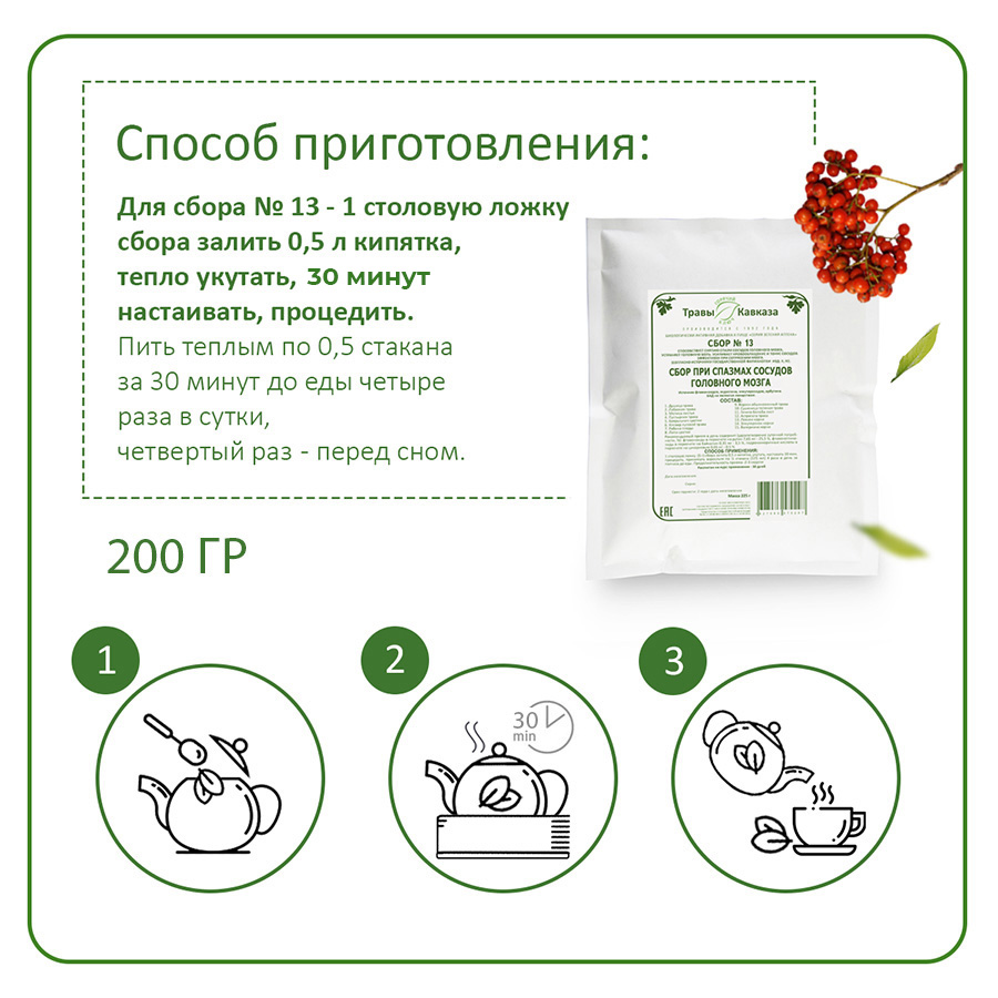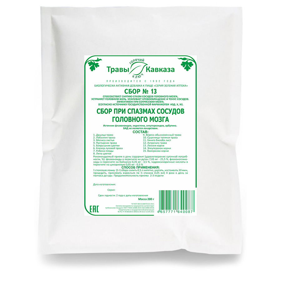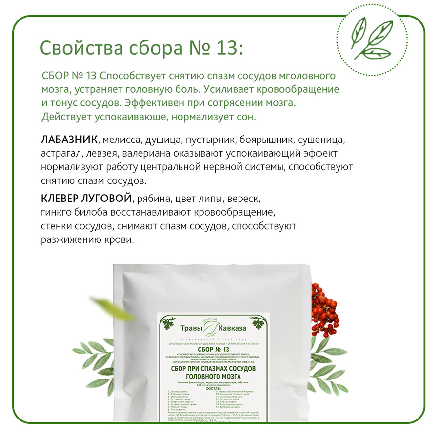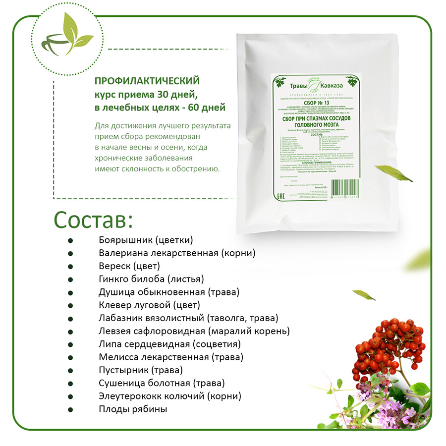 Этот сбор помогает улучшить кровообращение в головном мозге, устранить спазмы сосудов и облегчить головные боли. Он также поддерживает центральную нервную систему и способствует нормализации сна.