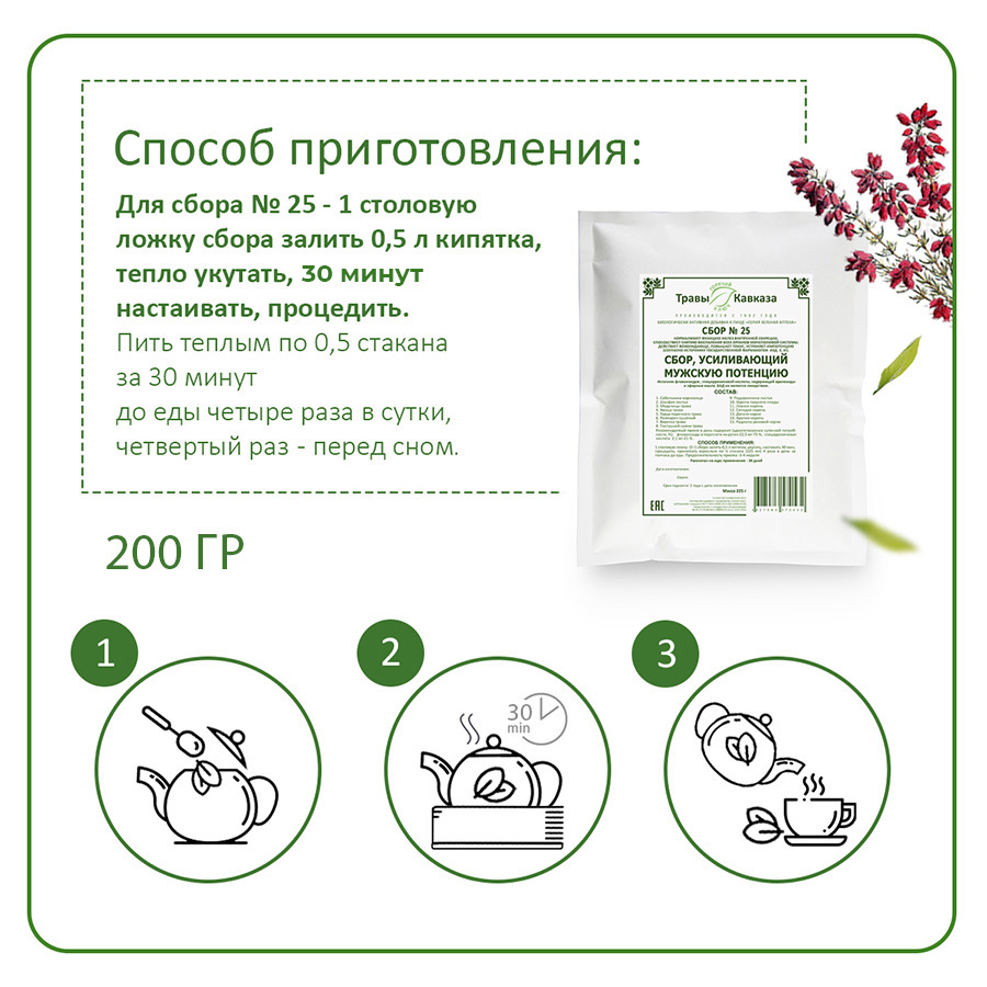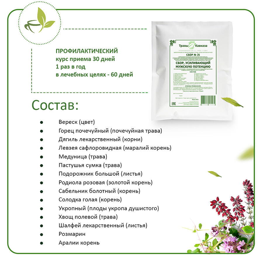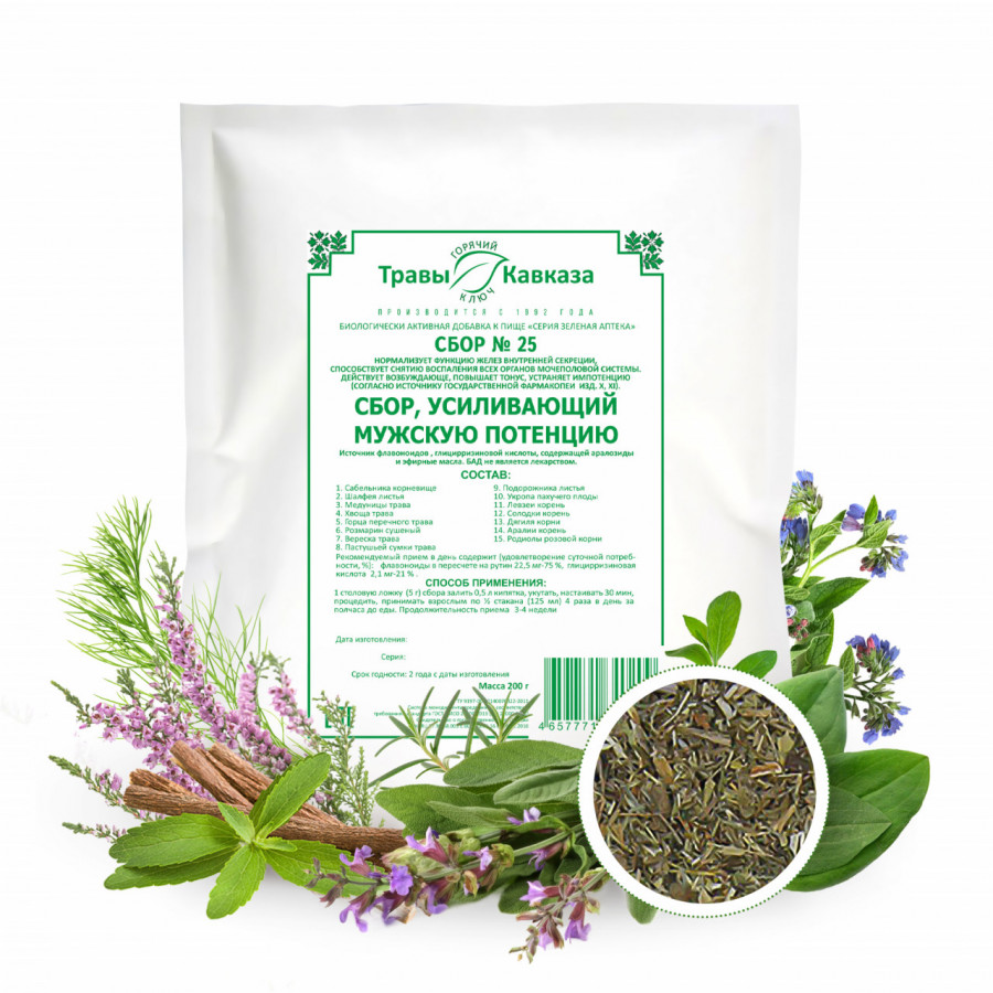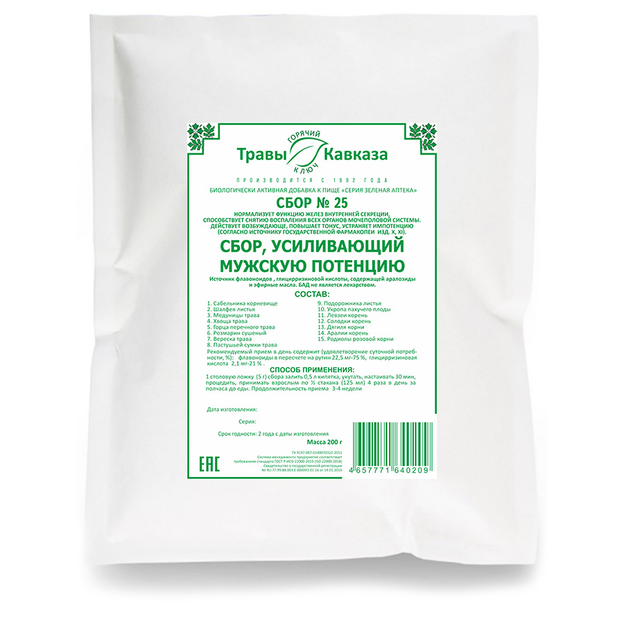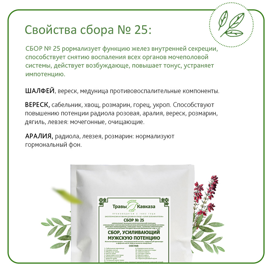 Важно: перед назначением курса необходимо пройти обследование, чтобы исключить импотенцию, как симптом более осложненного заболевания (простатит, аденома, заболевания нервной системы, сахарный диабет), иначе сбор №25 не будет иметь должного эффекта. Сбор №25 применяется после лечебного курса для закрепления результата.