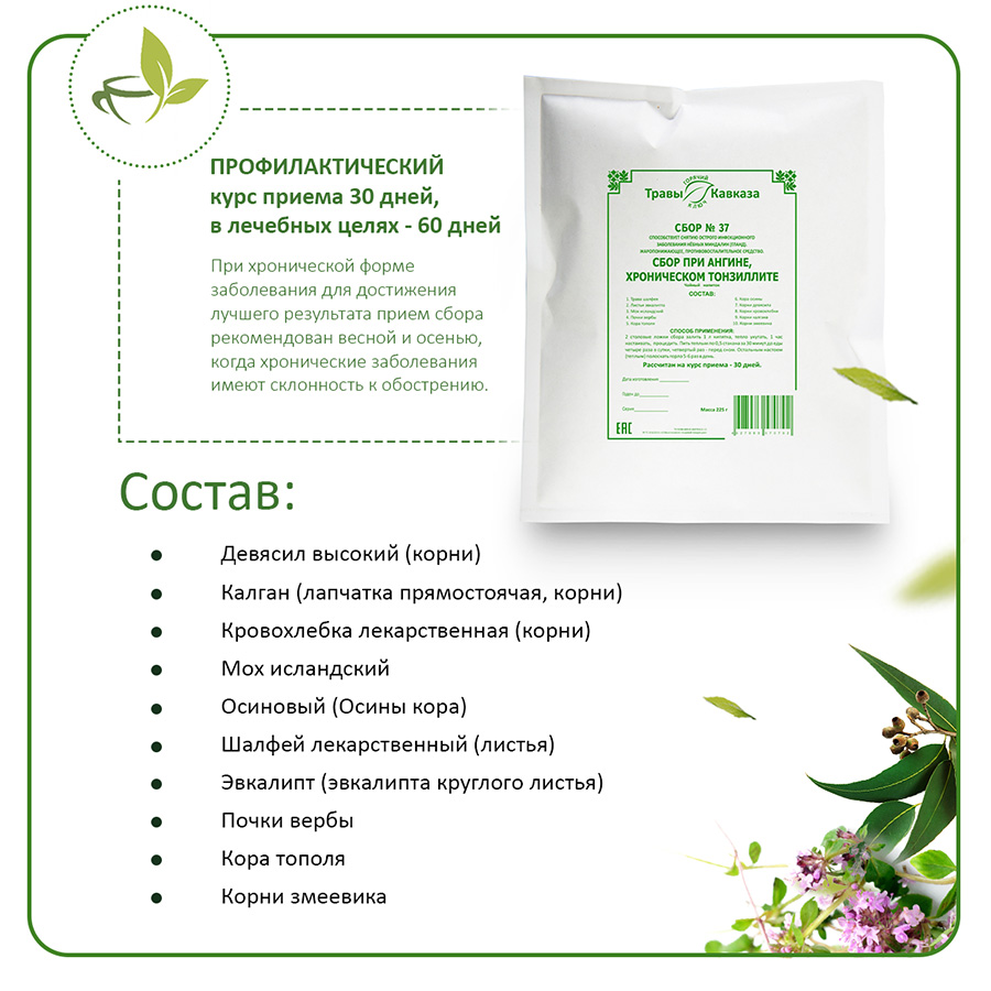Этот лечебный сбор эффективно помогает справляться с острыми и хроническими воспалительными процессами в горле при ангине и хроническом тонзиллите. Укрепляет иммунитет и выводит токсины из организма. Комплексное действие трав снимает воспаление, снижает температуру и поддерживает защитные функции организма.