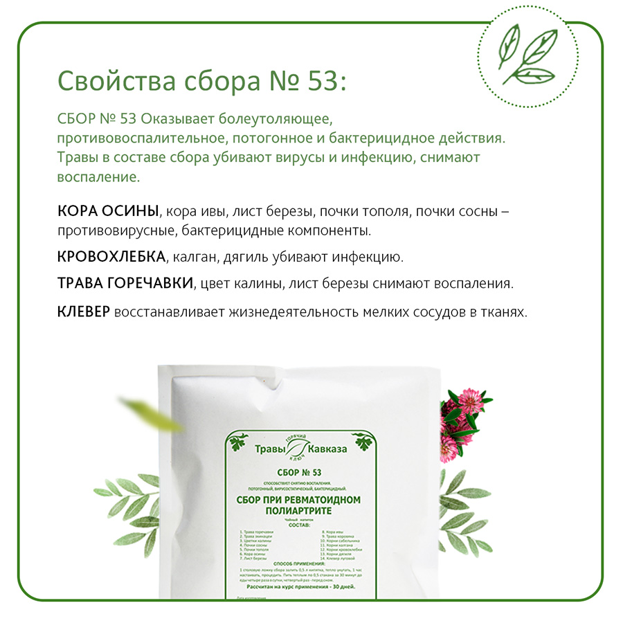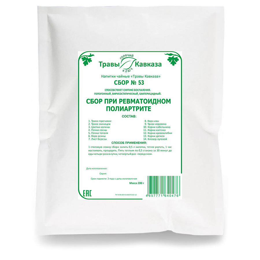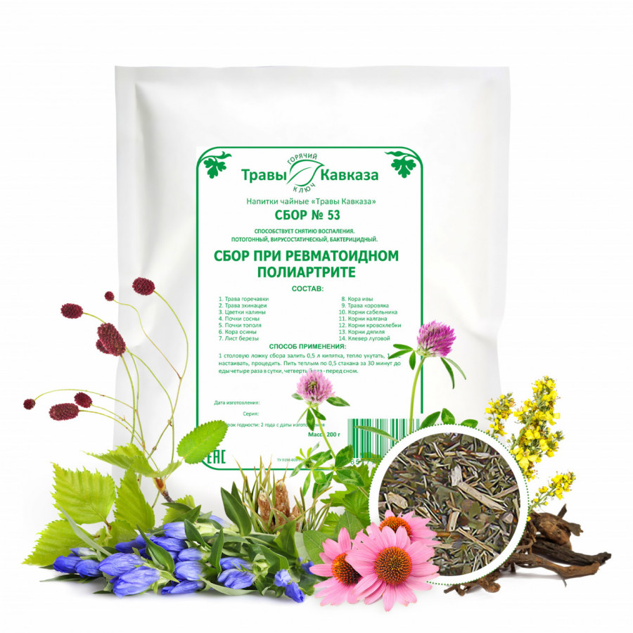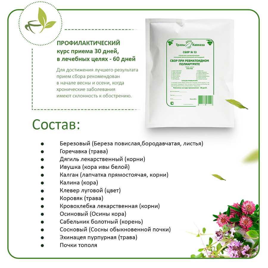 Если при ревматоидном полиартрите присутствуют сопутствующие заболевания такие как: отложение солей, подагра, артроз, артрит, остеохондроз, радикулит, чередуйте прием этого сбора со Сбор трав №66. Чередовать сборы через месяц, т.е принять 30 дней №53, 30 дней №66.