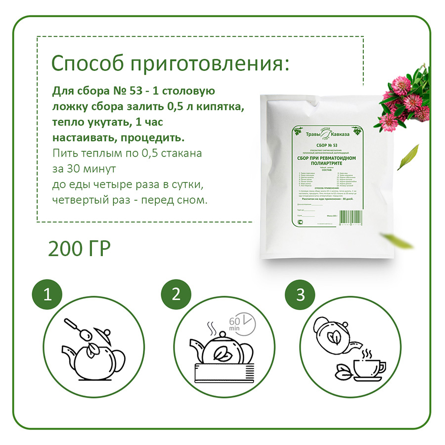 Сбор лекарственных трав №53 создан, чтобы помочь вам при ревматоидном полиартрите и вернуть свободу движений. Его тщательно подобранный состав направлен на комплексное воздействие: устранение воспалений, выведение солей и токсинов, снижение боли и поддержку естественных процессов регенерации.