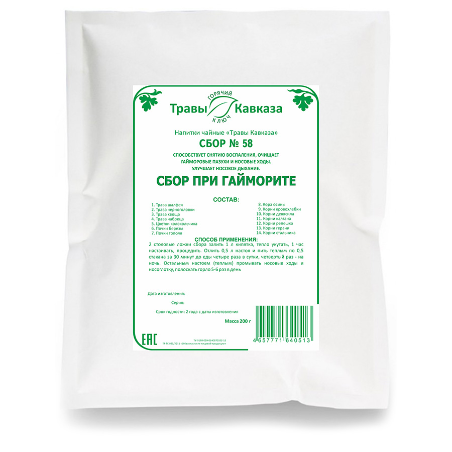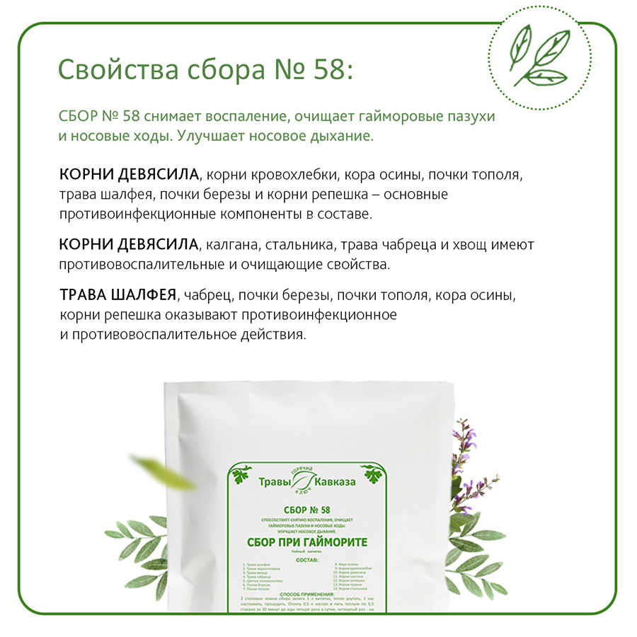 Мы используем дикорастущие травы, которые адаптировались к экстремальным природным условиям. Это усиливает их биологическую активность и делает их особенно полезными для здоровья. Сбор №58 включает натуральные компоненты с мощным противовоспалительным и очищающим действием. Он помогает справиться с симптомами гайморита, поддерживает здоровье дыхательных путей и обеспечивает комфортное носовое дыхание.