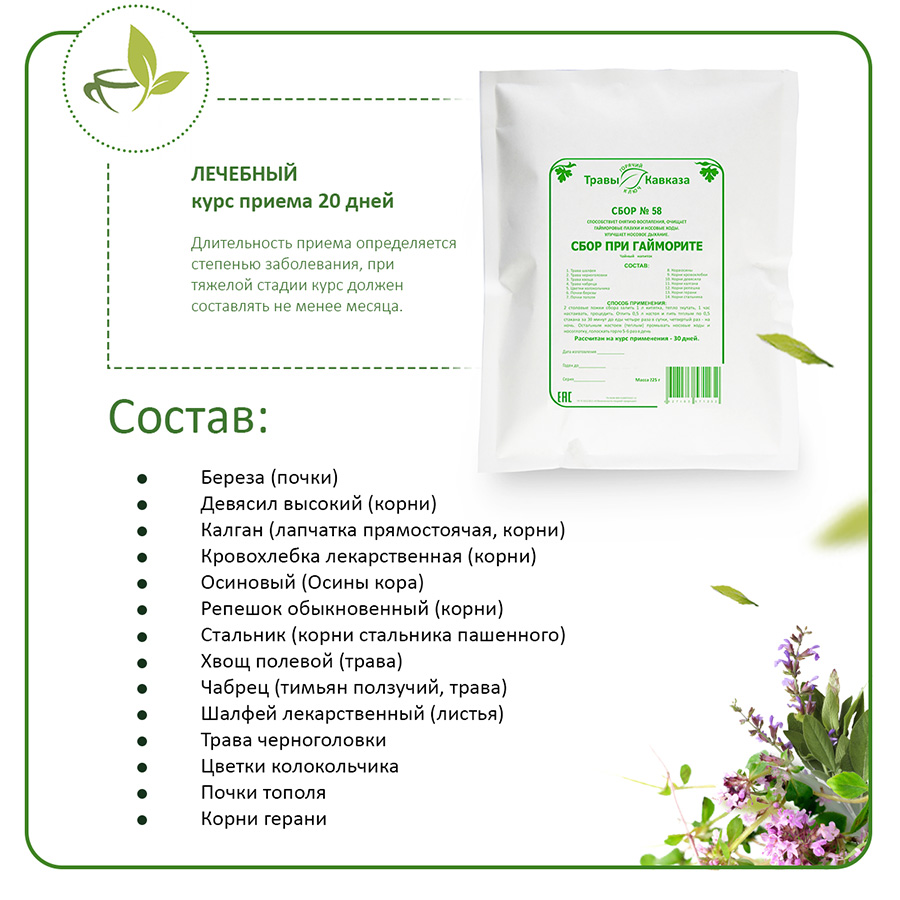 Сбор лекарственных трав разработан для лечения и профилактики гайморита. Его состав направлен на снятие воспаления, очищение гайморовых пазух и носовых ходов, а также улучшение носового дыхания. Природные компоненты обеспечивают противовоспалительное, противоинфекционное и очищающее действие.