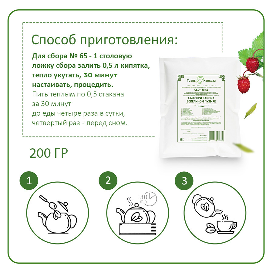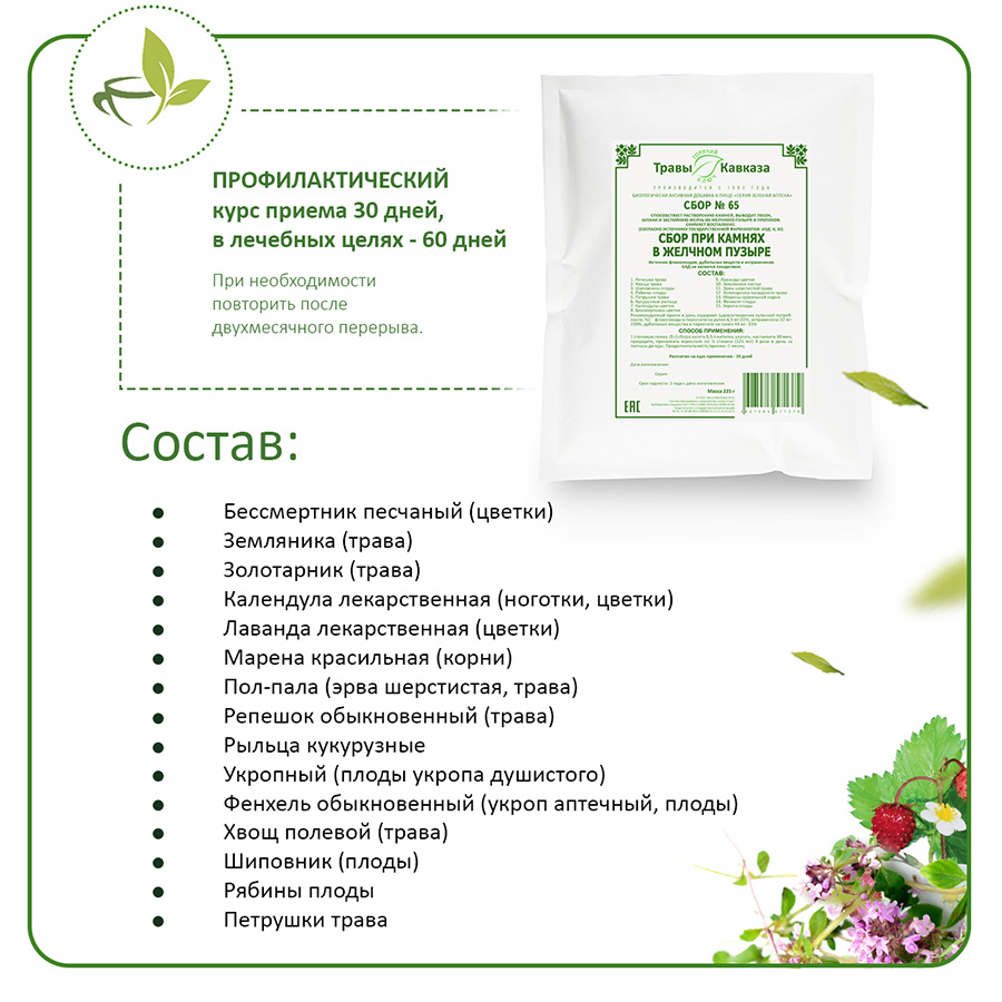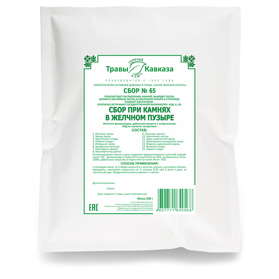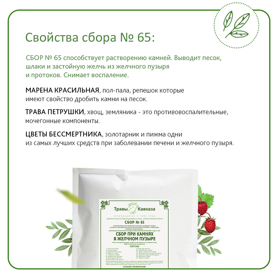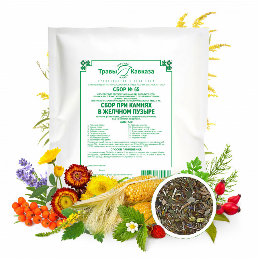 Сбор трав №65 — это натуральное средство, которое эффективно помогает растворить и вывести камни из желчного пузыря. Он обладает мощными противовоспалительными, желчегонными и мочегонными свойствами, разжижает желчь, выводит песок и шлаки, снимает воспаление и восстанавливает нормальное функционирование печени и желчного пузыря.