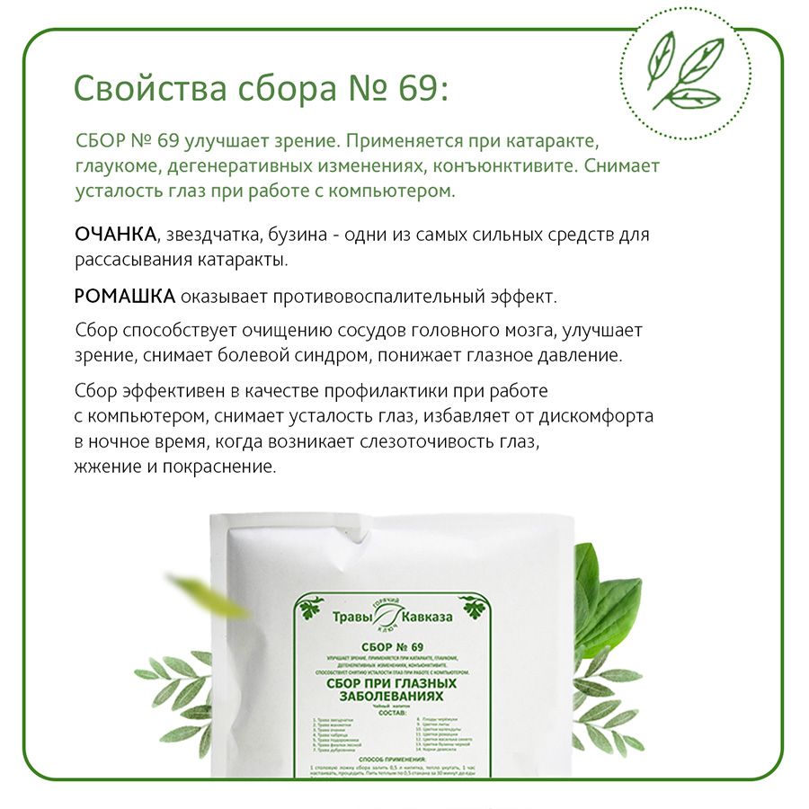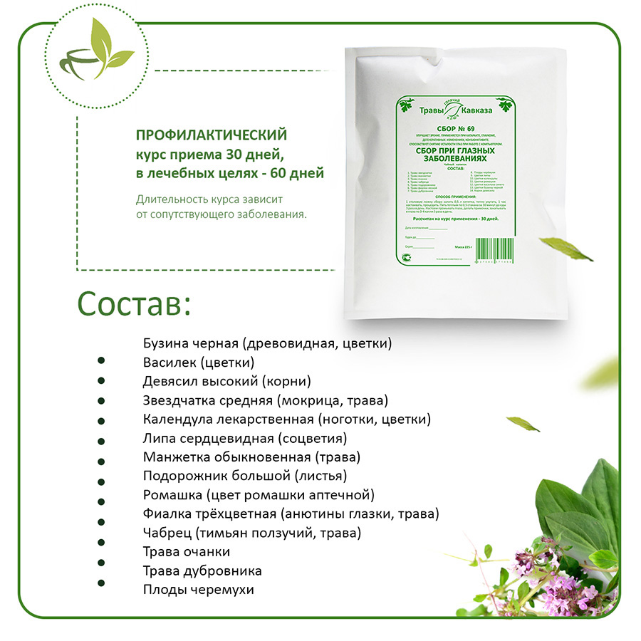 Этот сбор создан для поддержания здоровья глаз и эффективного лечения различных глазных заболеваний. Он помогает при глаукоме, катаракте, конъюнктивите, а также снимает усталость глаз при длительной работе с компьютером. Сбор оказывает мощное воздействие при профилактике и лечении заболеваний глаз, восстанавливает зрение. Применение в виде закапываний, компрессов и настоев помогает снять дискомфорт и поддержать здоровье глаз, особенно при интенсивной нагрузке.
