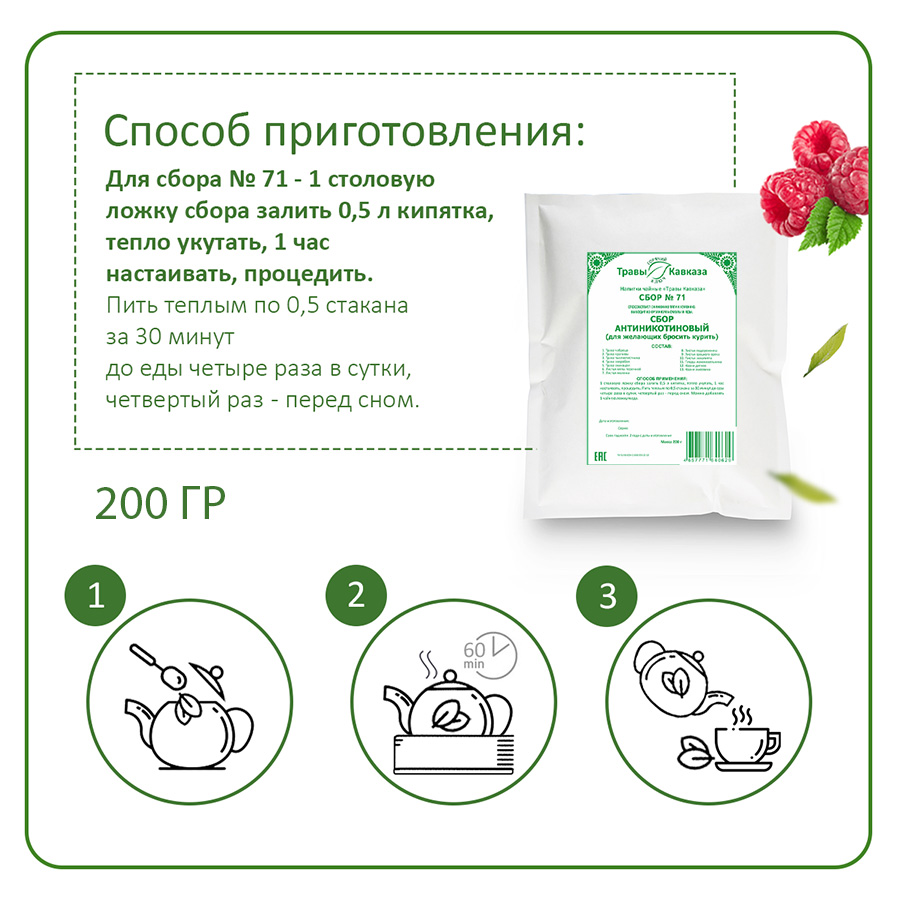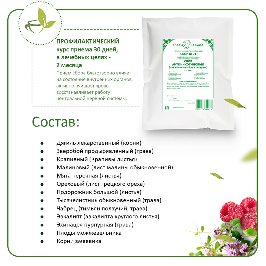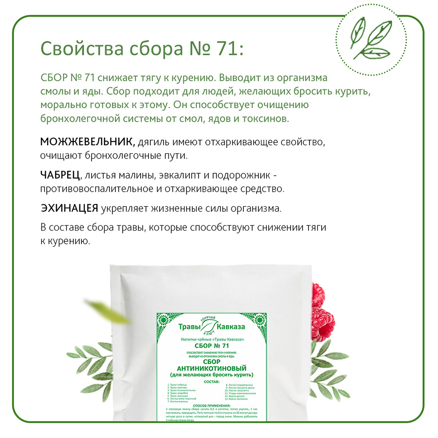 Сбор №71 разработан специально для борьбы с никотиновой зависимостью. В его состав входят только натуральные компоненты, собранные вручную и обработанные с соблюдением всех традиционных технологий. Это позволяет обеспечить максимальную эффективность и безопасность продукта.