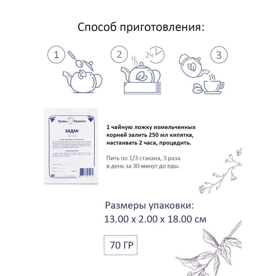 Благодаря экологически чистому сбору и бережной обработке, корень бадана от ®Травы Кавказа сохраняет максимум полезных свойств. Это натуральное и безопасное средство, которое станет вашим надежным помощником в заботе о здоровье.