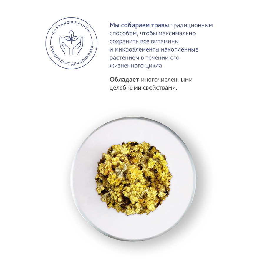 Бессмертник песчаный (Helichrysum arenarium) — это растение, которое излучает стойкость и гармонию. Его золотистые цветы, подобные маленьким солнцам, наполняют природу светом и теплом, несмотря на любые трудности окружающего мира. В составе бессмертника содержатся флавоноиды, эфирные масла, дубильные вещества и антиоксиданты, что делает его ценным помощником для поддержания здоровья.