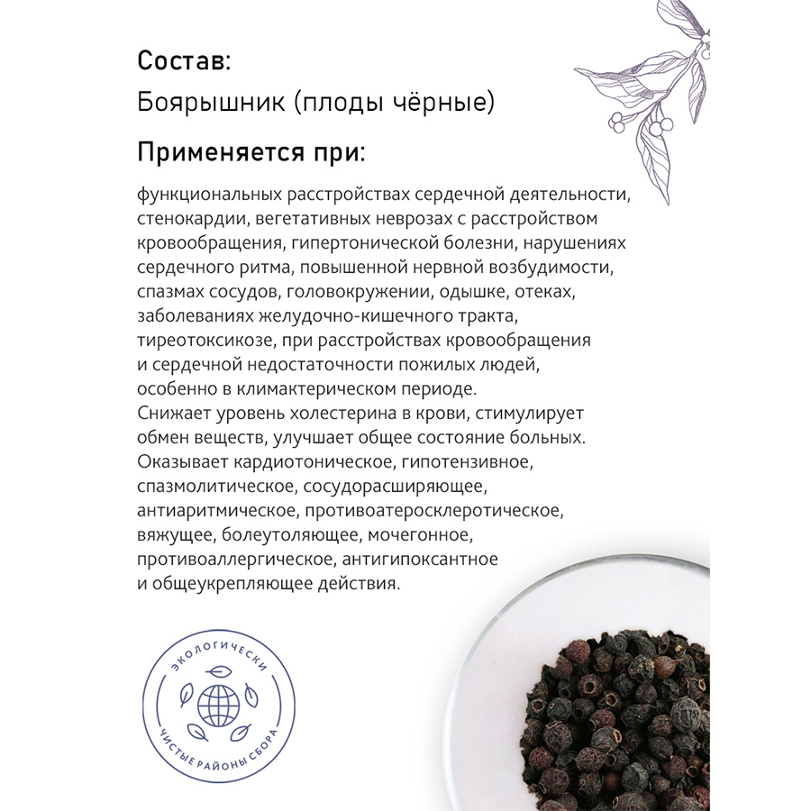 Боярышник черный(Crataegus nigra) — природный помощник для сердца, уникальное растение, богатое витаминами и микроэлементами. Его плоды и цветки заготавливают в период максимального содержания полезных веществ: ягоды — после полного созревания, цветки — в начале цветения. Для сохранения всех ценных компонентов сбор производится вручную, а сушка проходит в естественных условиях. Боярышник издавна используется для поддержания здоровья сердечно-сосудистой системы и общего укрепления организма.