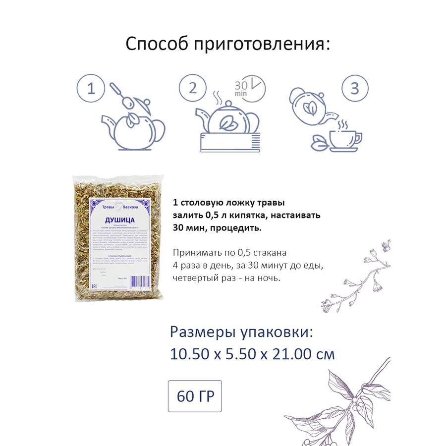 Душица (Origanum vulgare) – ароматное лекарственное растение, обладающее широким спектром полезных свойств. В ее составе содержатся эфирные масла, флавоноиды, дубильные вещества, аскорбиновая кислота, фитонциды, горечи и микроэлементы. Сырье заготавливают в период цветения, аккуратно срезая верхушки растений. Душицу сушат в тени, чтобы сохранить максимальное количество активных веществ.