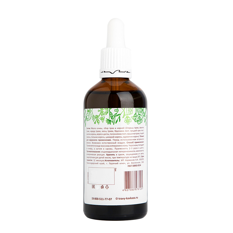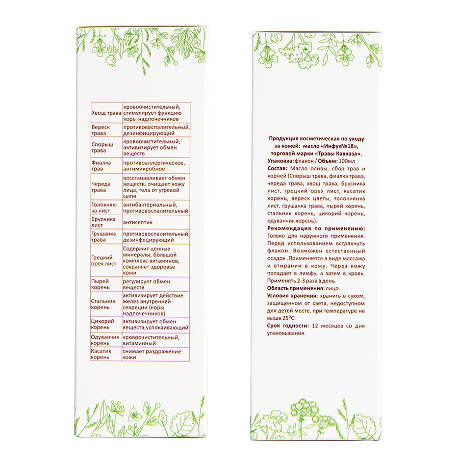 Инфуз №18 — это не просто масло, а настоящая целительная вытяжка из трав и корней, собранных в экологически чистых районах: спорыша, фиалки, череды, хвоща, брусники, грецкого ореха, касатика, вереска, толокнянки, грушанки, пырея, стальника, цикория и одуванчика.