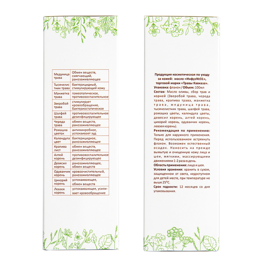 Инфузное масло №31 — это уникальная масляная вытяжка на основе оливкового масла и целебного сбора из 14 трав и корней, ваш верный союзник на пути к красивой, ухоженной коже.