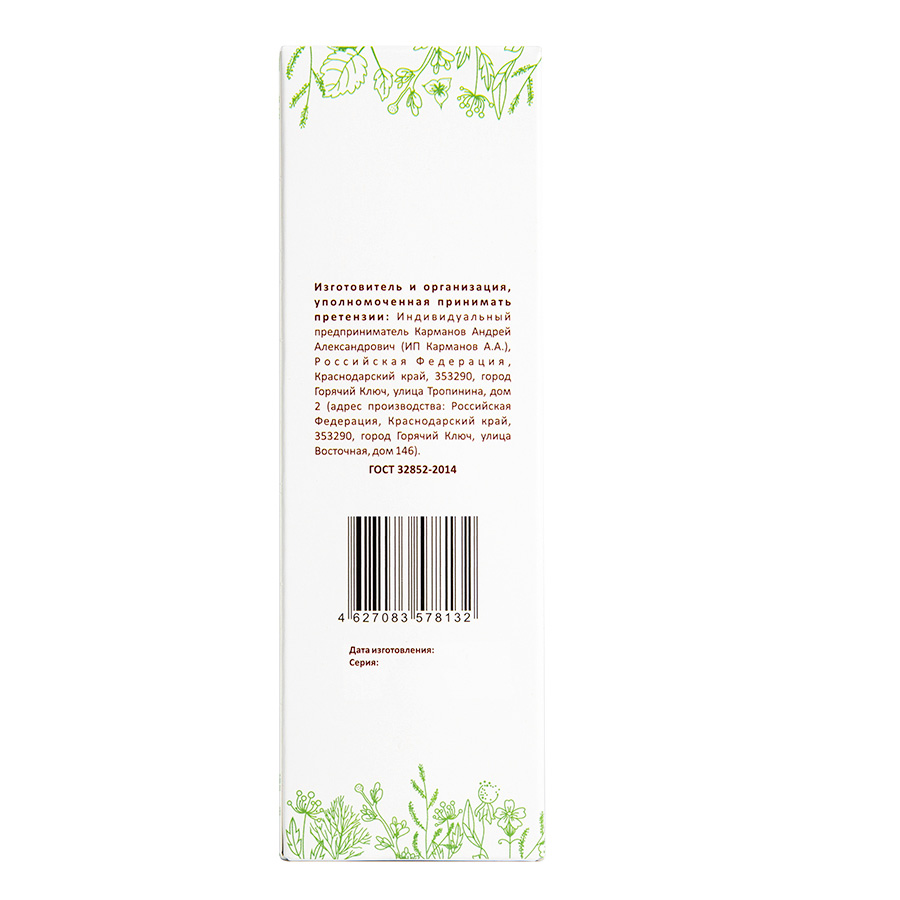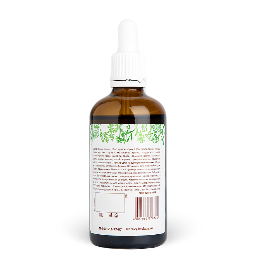 Состав: 100% натуральное масло оливы, сбор трав и корней (зверобой трава, череда трава, крапива трава, манжетка трава, медуница трава, тысячелистник трава, шалфей трава, ромашка цветы, календула цветы, девясил корень, алтей корень, цикорий корень, одуванчик корень, левзея корень).