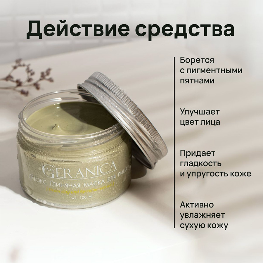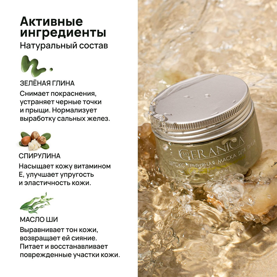 - Детокс и очищение – вытягивает токсины, сужает поры и нормализует работу сальных желез