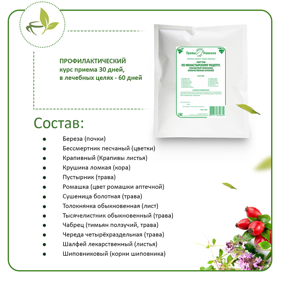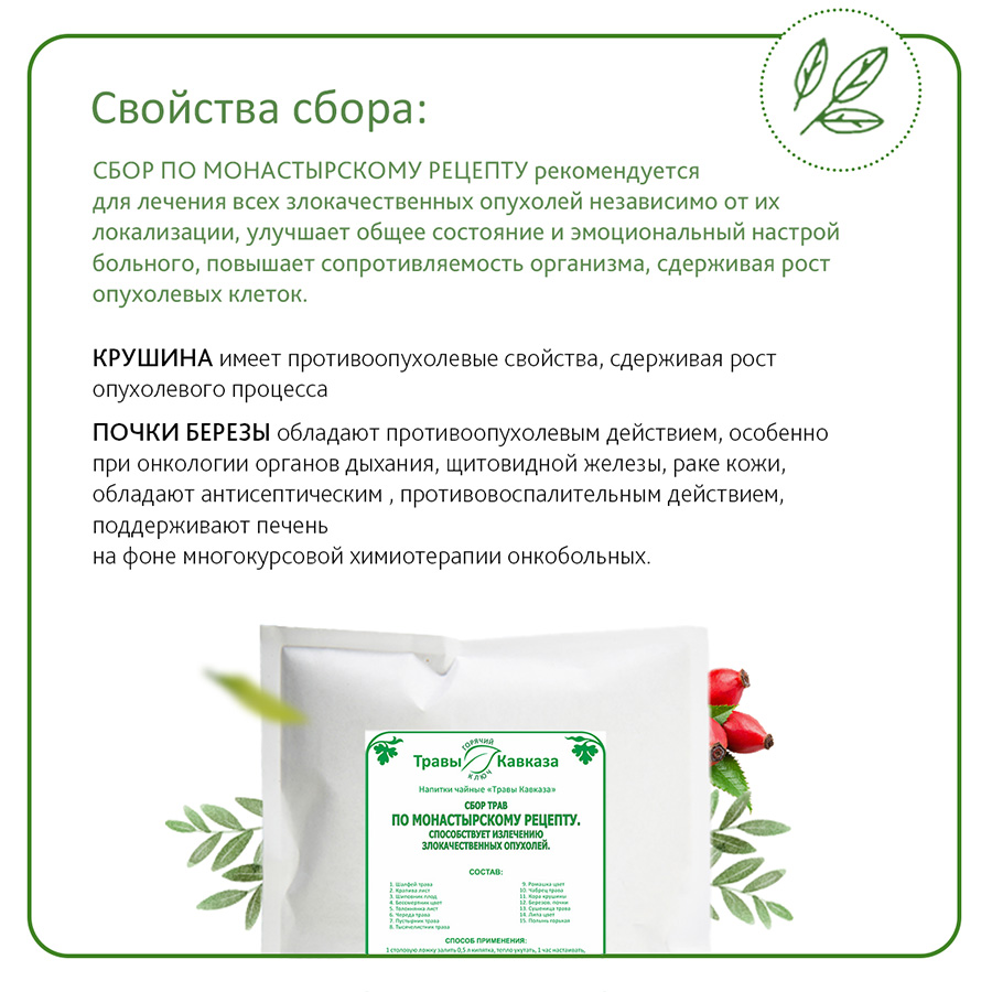 Сбор трав по Монастырскому рецепту от рака – это уникальный фитотерапевтический комплекс, который поддерживает иммунитет, снимает боль, улучшает эмоциональное состояние и возвращает силы для борьбы. Его уникальный состав помогает организму сопротивляться болезни, замедляя разрушительные процессы. Это забота о вашем здоровье, которая продлевает жизнь и дарит комфорт даже в такие сложные периоды.