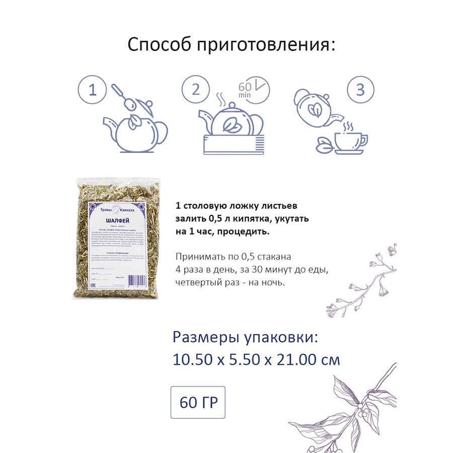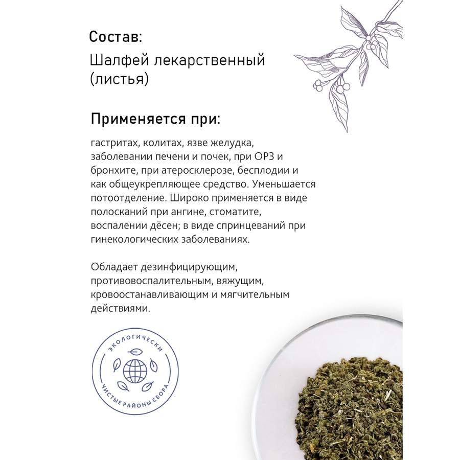 Наш шалфей выращивается на солнечных склонах Кавказа, где он накапливает максимальное количество эфирных масел. Мы собираем только молодые листья первого года вегетации, которые содержат в 1,5 раза больше сальвина, чем старые побеги. Специальная технология естственной сушки позволяет сохранить до 98% активных веществ. Каждая партия проходит тройной контроль: на содержание эфирных масел (не менее 1,5%), отсутствие пестицидов и тяжёлых металлов.