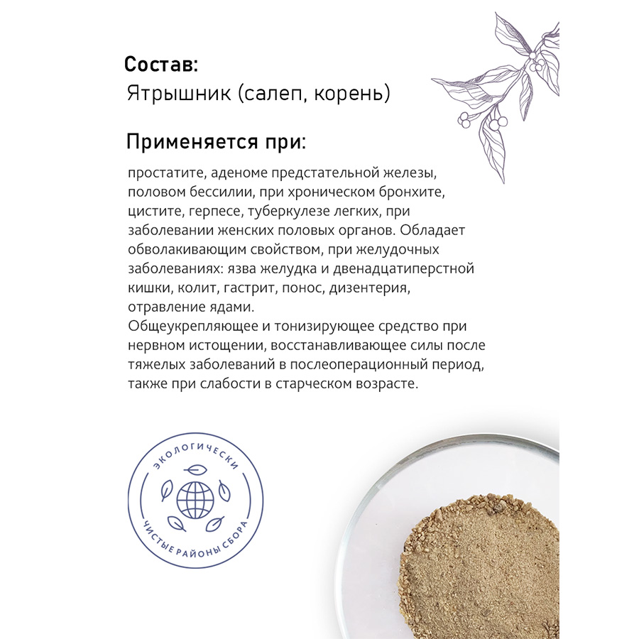 Наши корни ятрышника собираются в экологически чистых горных районах Кавказа, где растения накапливают максимальное количество слизистых веществ. Мы используем только молодые клубни, собранные в строго определённый период. Специальная технология обработки позволяет сохранить до 95% ценных полисахаридов.